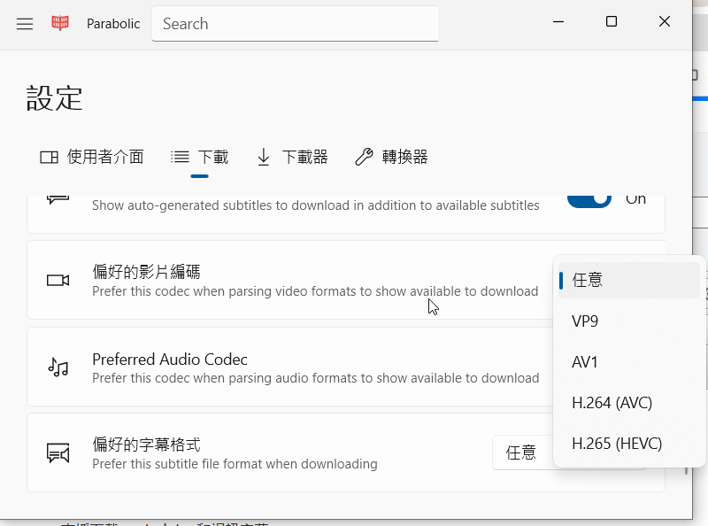Parabolic左上角的編好設定 → 一般設定,將影片編碼切換為H.264,確保下載後的影片在大多數裝置都能播放。